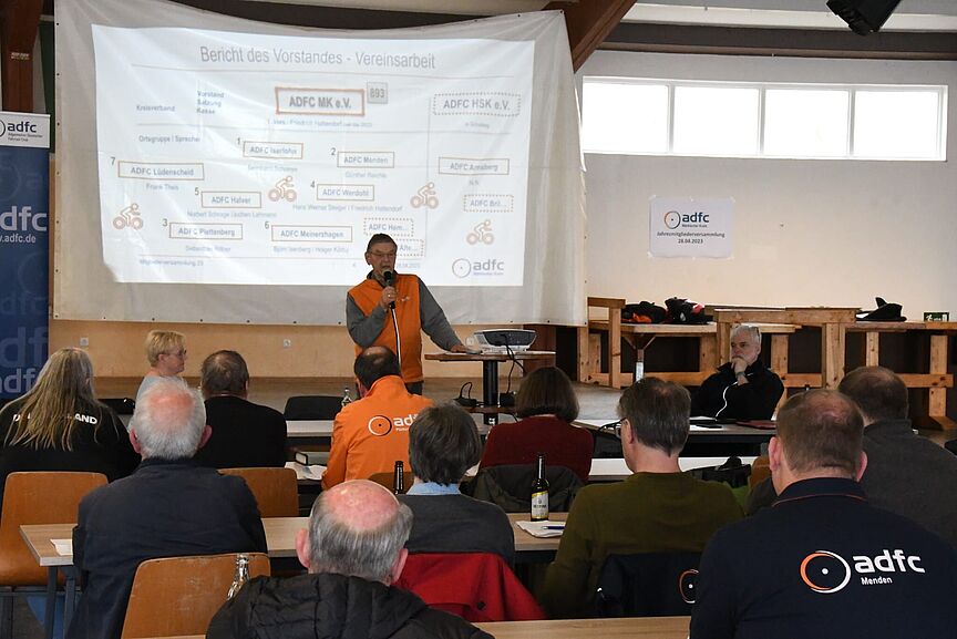 Versammlungsleiter und 1. Vorsitzender des ADFC MK Friedrich Hattendorf berichtete den knapp 30 Teilnehmern über die Aktivitäten und Geschäftszahlen des abgelaufenen Jahres. Die Mitgliederzahl konnte weiter erfolgreich gesteigert werden.